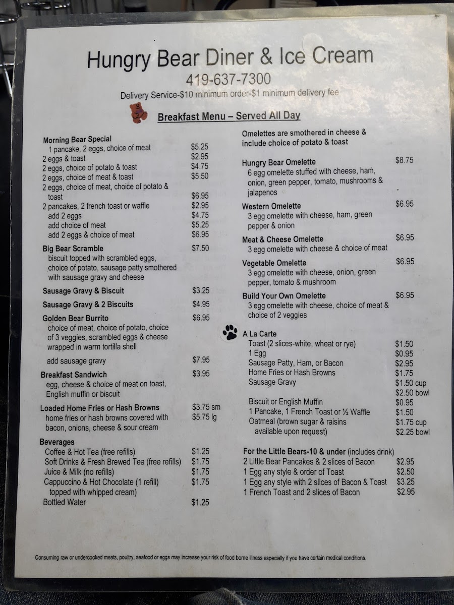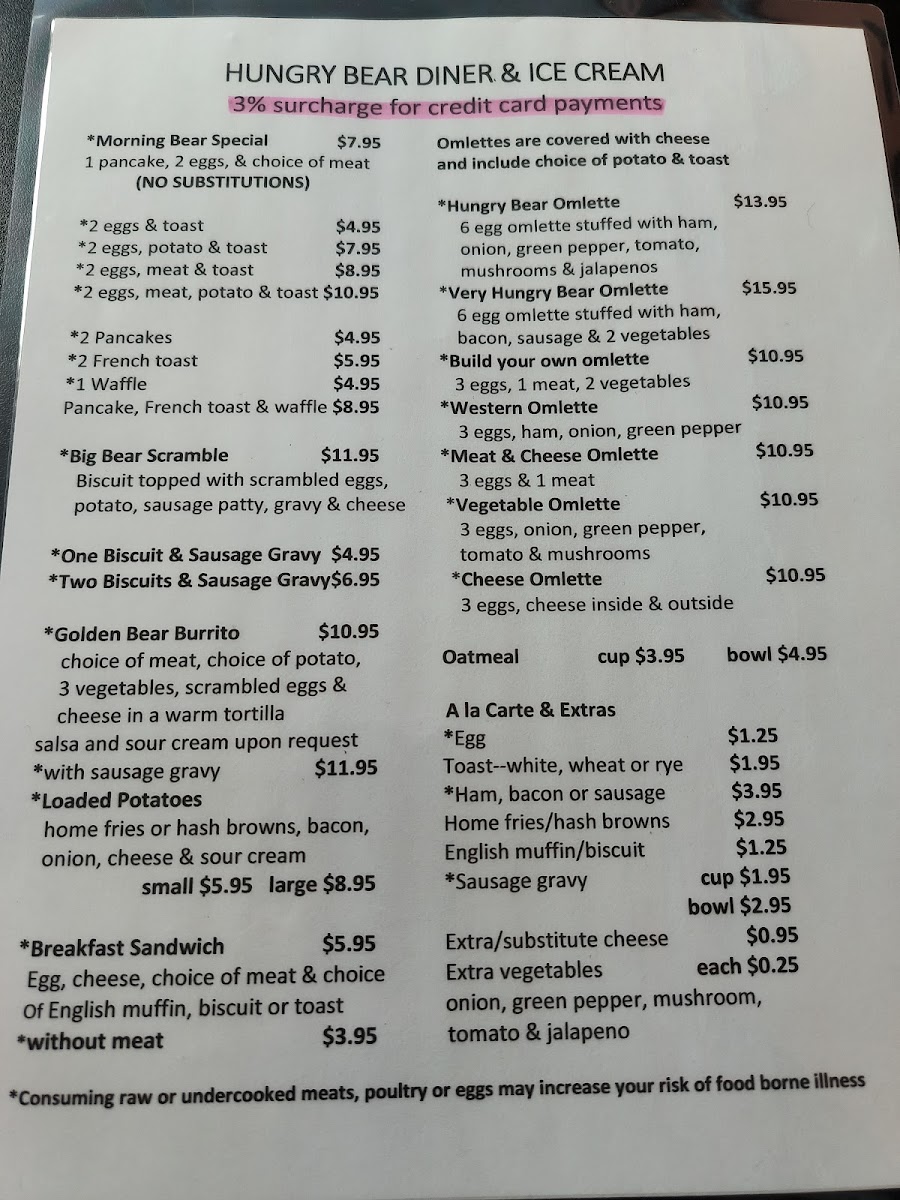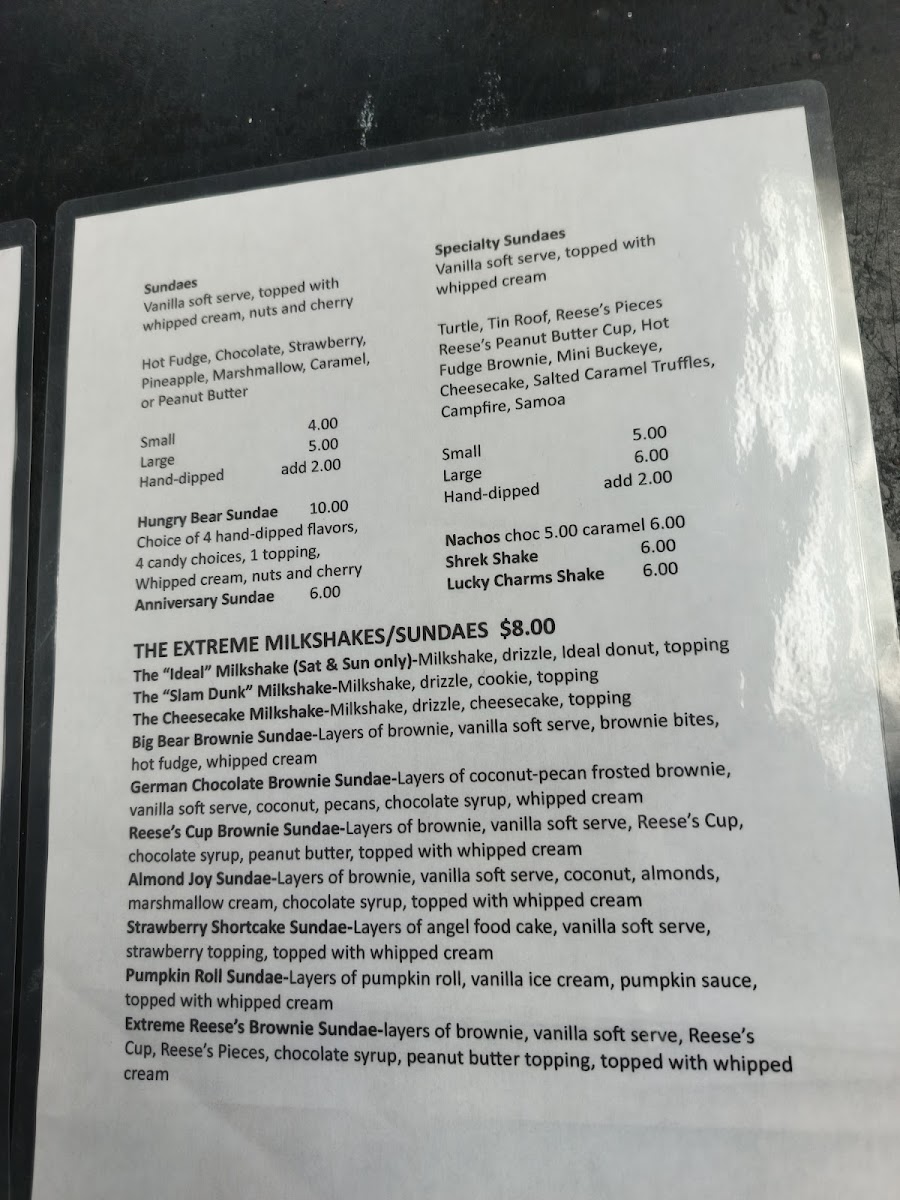 The menu at Hungry Bear Diner & Ice Cream offers a delightful selection of hearty breakfast dishes and indulgent treats. For breakfast, the Big Bear Scramble and Sausage Gravy & Biscuit are popular choices, with the latter also available with 2 Biscuits for those looking for extra comfort. If you're in the mood for something more substantial, the Golden Bear Burrito and Breakfast Sandwich are sure to satisfy. Pair your meal with a refreshing beverage, such as a Soft Drink & Fresh Brewed Tea, or opt for a more comforting drink like Cappuccino & Hot Chocolate. For lighter options, the Toast, 1 Egg, Biscuit, or English Muffin are available a la carte. For those with a sweet tooth, the diner offers extravagant Extreme Milkshakes like the "Ideal" Milkshake, "Slam Dunk" Milkshake, and the decadent Cheesecake Milkshake. If you're craving something indulgent for dessert, the Big Bear Brownie Sundae and German Chocolate Brownie Sundae are excellent choices. For a more classic breakfast or snack, the Oatmeal is always a comforting option.